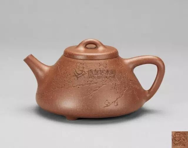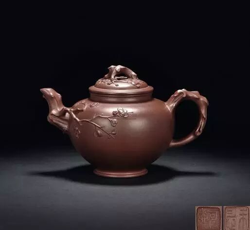 “梅報(bào)春壺”原為江蘇宜興紫砂工藝廠陳列室藏品,是朱氏最負(fù)盛名的作品之一。以梅花報(bào)春為題,在挺秀飽滿的壺身上,運(yùn)用雕鏤和捏塑等多種手法,生動(dòng)地刻劃了梅花不畏風(fēng)霜嚴(yán)寒之英姿,端麗穩(wěn)重,精致傳神。