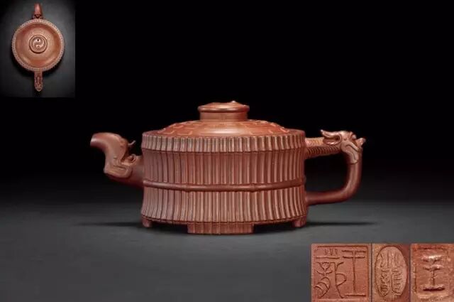 此為邵大亨名壺,以64根長(zhǎng)竹段圍成壺身以合64卦之?dāng)?shù)。以32根短竹段分成四組,每組8根,結(jié)以成足。壺蓋浮雕八卦圖,蓋鈕成太極圖,頗有匠心。