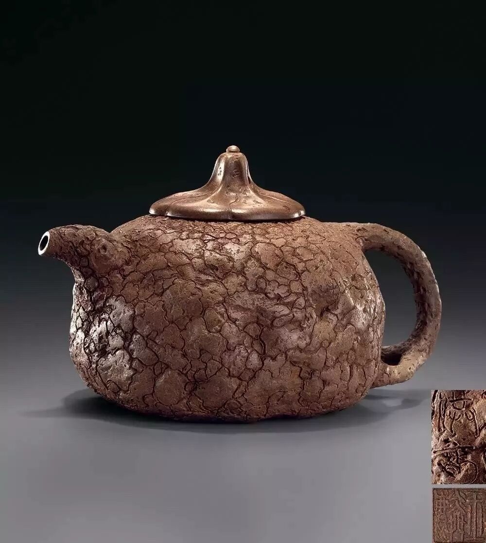 此壺外形似銀杏樹癭狀。壺身作扁球形,泥質(zhì)成素色,凹凸不平,古縐滿身,紋理繚繞,寓象物于未識(shí)之中,大有返璞歸真的意境。