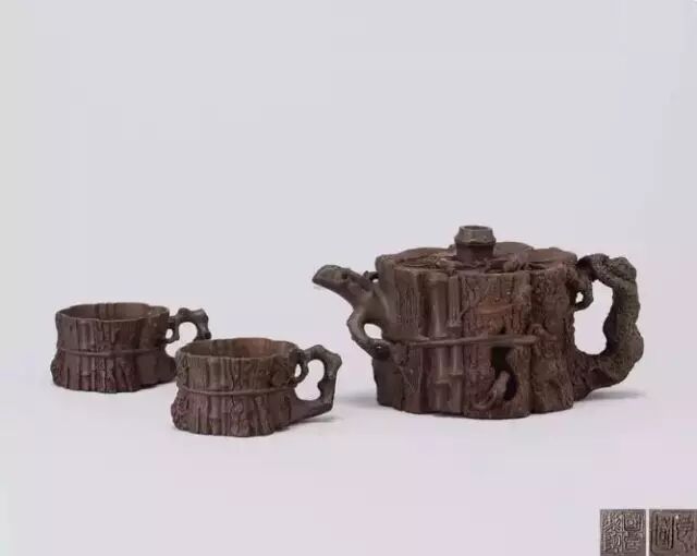 兩只嬉戲的松鼠,平添了幾分生趣。另配兩把茶杯及托盤(pán)與壺相輔。