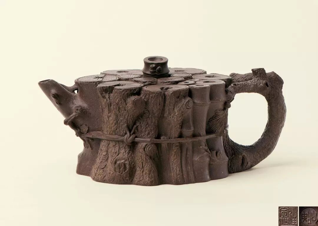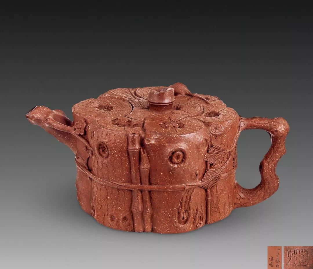 壺體為松竹梅樹(shù)段,直流,流底部伸出梅花點(diǎn)點(diǎn),令深色的壺體增添趣味。