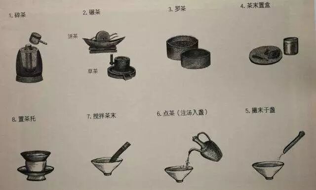 ? ? ? 宋徽宗著作《大觀茶論》里對(duì)點(diǎn)茶法進(jìn)行了詳細(xì)的闡述與論證,オ讓這門技藝完整地傳承至今。這種技藝的主要目的是用來鑒別茶的好壞——先從茶餅上取下一塊,包在紙中細(xì)細(xì)碾碎,篩出茶末放入茶盞,用晾過之后的沸水緩緩倒入茶盞,先將茶末調(diào)成膏狀,再継續(xù)用水沖點(diǎn),一邊沖點(diǎn)一邊用力攪動(dòng)茶膏,直到茶面浮出白色的細(xì)沫。細(xì)沫越是潔白,散去得越晚,茶葉越好。