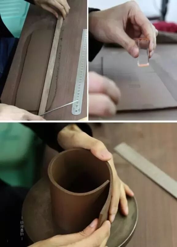 將拍出雛形的身筒納入專型的石膏模具內,然后用專用工具進行推、勒、刮等制作完成。留有兩道模具縫的泥接頭,分別留在嘴部和把手部。
