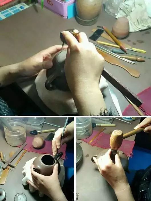 4. ?做嘴、把、足。挖壺嘴,控“把”的型,挺直有力,要求厚度均勻、內(nèi)壁平整,這樣才出水流暢。