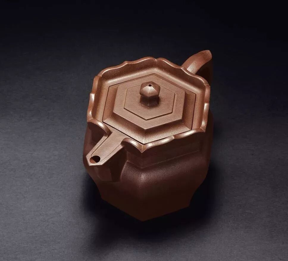 此為顧景舟先生所制,采六瓣菱花式造型,橋形蓋鈕與口、身、圈足協(xié)調(diào)統(tǒng)一成一只六方菱花,筋囊向口收縮與蓋上菱花紋路緊密吻合,毫厘不差。
