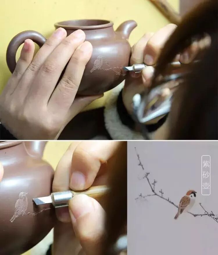 紫砂鐫刻,與古印陶是一脈相承的,也是古印陶的延續(xù),有一定的藝術(shù)價值和欣賞價值。一把沒有刻款的壺,使人感到不完整,價值平平,一把刻款不好的壺也使人感到藝術(shù)內(nèi)涵不夠。