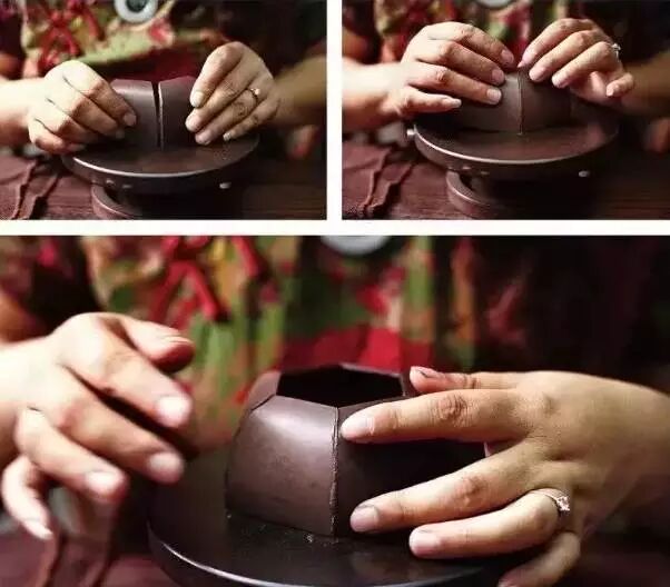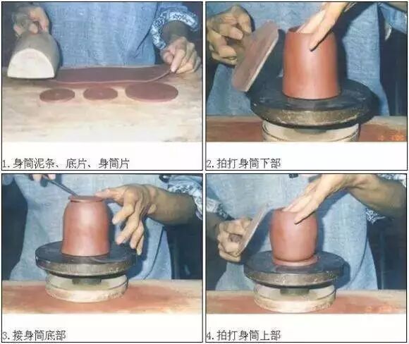 旋出口、底、以及圍片,然后把圍片粘貼在轉(zhuǎn)盤(pán)的正中,把泥條沿著圍片圍好,圈接成一個(gè)泥筒,再以左手襯托在圓筒內(nèi),以右手用薄木拍子,拍打成型。此種成型方法是正真的傳統(tǒng)紫砂壺制作,主要用于半手工壺和全手工壺。