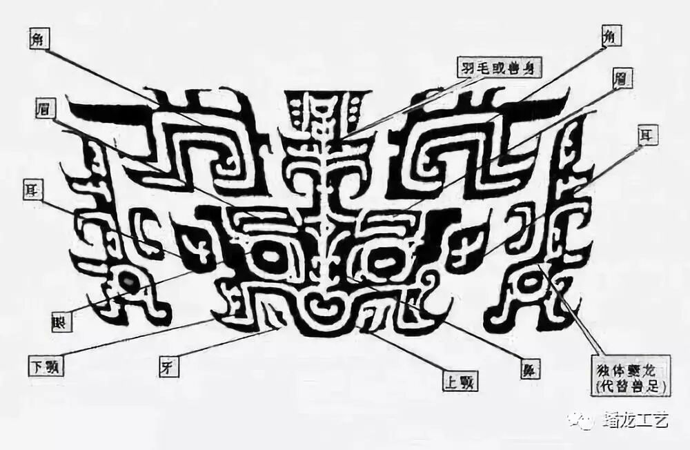 饕餮紋一般以動物的面目形象出現(xiàn),具有蟲、魚、鳥、獸等動物的特征,由目紋、鼻紋、眉紋、耳紋、口紋、角紋幾個部分組成。面目結(jié)構(gòu)較鮮明,也正是利用這些特征,將人們引到了一個神秘的藝術(shù)世界,商代的饕餮紋在吸引人們注意力方面是特別有效的。饕餮紋兇猛莊嚴(yán),結(jié)構(gòu)嚴(yán)謹(jǐn),制作精巧,境界神秘,是青銅器裝飾圖案中最優(yōu)秀的作品之一,代表了青銅器裝飾圖案的最高水平。