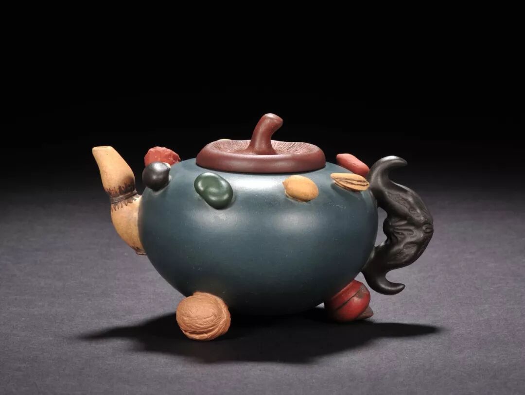 看過(guò)蔣蓉的人物傳記后,才知這是一位不管歷經(jīng)多少磨難都能保持一顆少女心的女子。一切自然界的生命,一旦被她看中,即可幻化今生,縱身一躍而成為小小精靈,被永遠(yuǎn)定格在紫砂藝術(shù)的天地之中。香菇、核桃、菱角、瓜子……普通的果子被靈巧地捏出,成為了壺的一部分,相比那些其他人所制的大氣嚴(yán)謹(jǐn)?shù)膲兀Y蓉的壺體現(xiàn)出她與眾不同的天真爛漫的情趣。