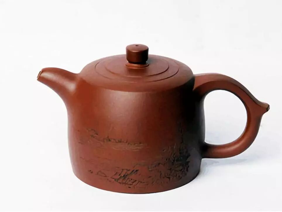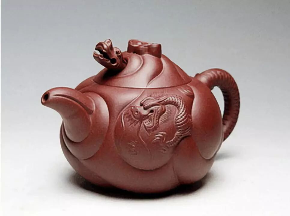 典型傳統(tǒng)壺型,是魚躍龍門之意,民國(guó)的唐樹芷所制小魚化龍壺鈕為卷云狀,壺身淺塑波浪,波浪中龍伸出首部,龍尾卷成壺把,把上鱗片刻劃清晰,此壺紅泥制成,形體較小,做工精細(xì)。