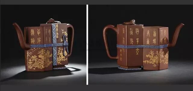 清乾隆 紫砂描金朗岑銘山水題詩書卷式雙聯(lián)壺