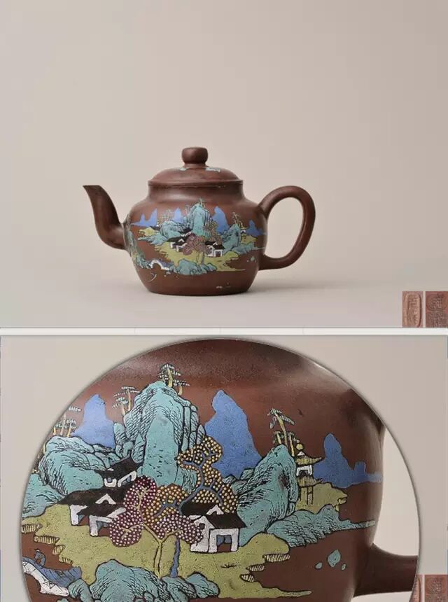 清乾隆 邵元祥制加彩山水紫砂大蓮子壺