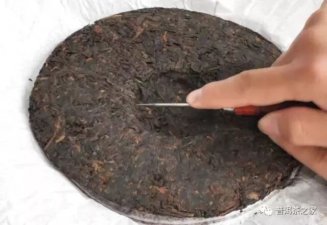 茶針撬茶能夠快速進(jìn)去,但是要小心扎手。用茶針怎么撬餅?茶針拆茶餅的時(shí)候,則需要從餅背中心的凹陷處下針,沒(méi)個(gè)普洱茶餅的背面都有這樣一個(gè)凹陷的地方,這個(gè)設(shè)計(jì)也是為了方便拆餅。將茶針從凹陷處插入到茶中,向四周放射性的撬起(有點(diǎn)像是發(fā)射火炮)。這樣入針的好處:一來(lái)從凹陷處入手比較容易撬起,二來(lái)可比保持餅面的完整和美觀,但是要注意別被茶針扎到手。