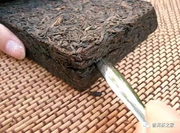 以茶磚為例,撬茶磚的入刀以側(cè)面為宜,一只手按好茶磚,另一只手拿茶刀從茶磚的側(cè)面入刀,將茶刀從邊緣插入茶磚內(nèi)部,再往上提起,這樣就能輕松的撬起一片茶。剩下的就是一片一片拆開(kāi),似乎有點(diǎn)像是在片魚(yú)片,保持條索的完整最重要。