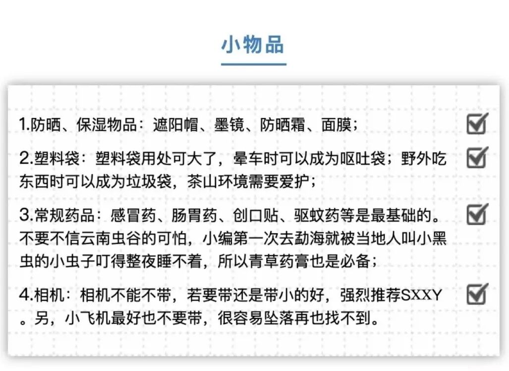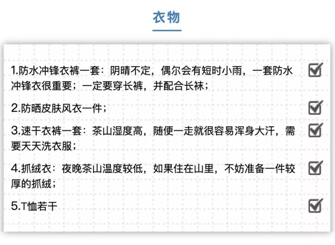 以一般在茶山待五天計算,我更加推薦你用50L以上的登山包,并列出了以下清單以供參考: