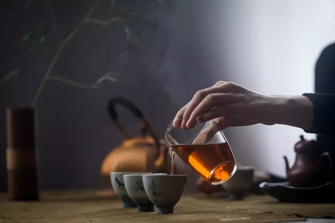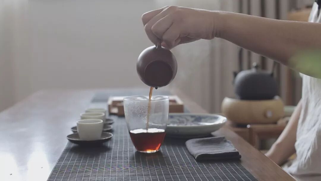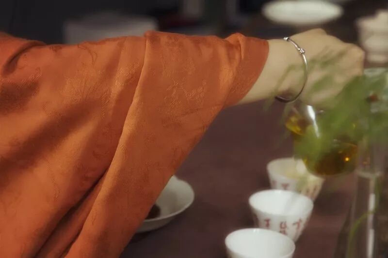 公道杯需左右手交替分茶,是為了避免碰翻茶具、打擾客人用茶。在茶席中,手部的操作軌跡不允許出現(xiàn)任何交叉動作,也不允許雙臂和手腕跨越茶席上的任何器具。