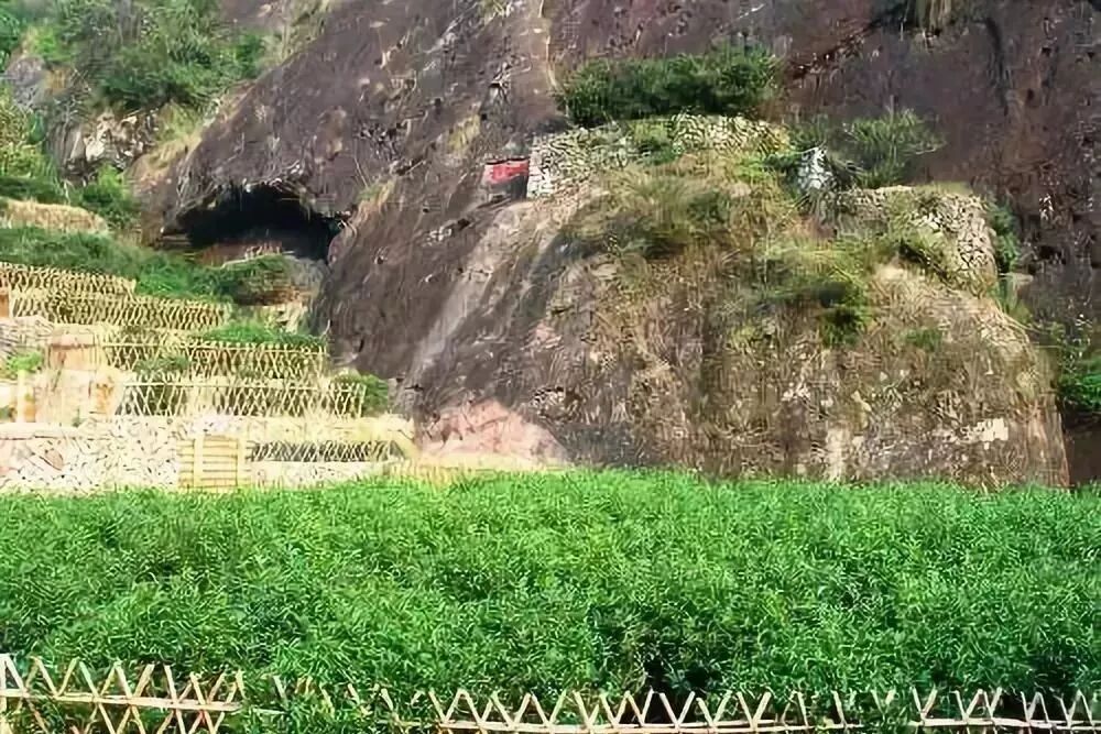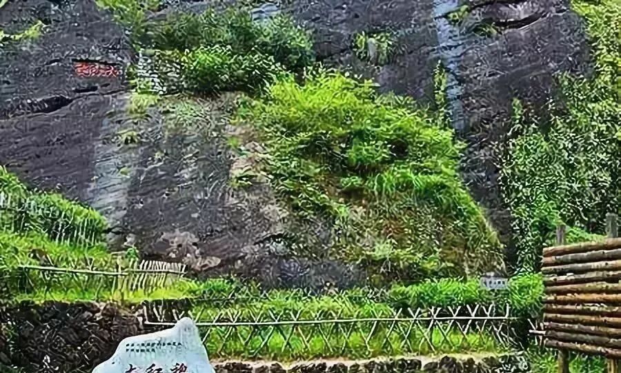 武夷山大紅袍是全國最富盛名的茶之一,名氣不亞于龍井、普洱等。而大紅袍的四株始祖茶樹就生長于武夷山東北部,天心巖下永樂禪寺之西的九龍巢陡壁上,傍邊的巖壁上至今仍保留著1927年天心寺和尚所作的“大紅袍”石刻。