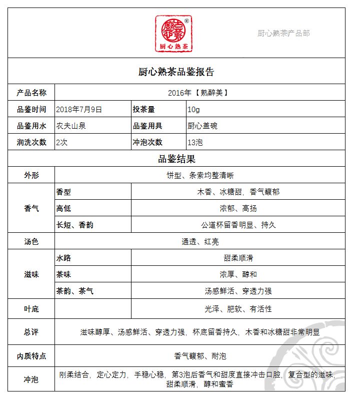 一款優(yōu)質(zhì)的熟茶要綜合考慮它的干凈度、醇度、滑度、厚度,再而就是最重要的香氣和甜潤(rùn)度。熟醉美,首先把我們廚心熟茶最突出的特征:干凈,表現(xiàn)得非常出色,茶湯進(jìn)入口腔,醇、滑,再而把我們廚心味的“甜、柔、順、滑”演繹得淋漓盡致,毫無(wú)疑問(wèn),是我們品牌最具代表標(biāo)桿茶。