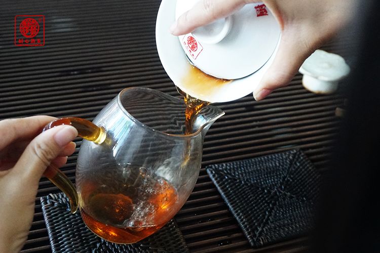 ·出湯,沿著公道杯壁緩緩倒入,保證茶湯的質(zhì)感和透亮度