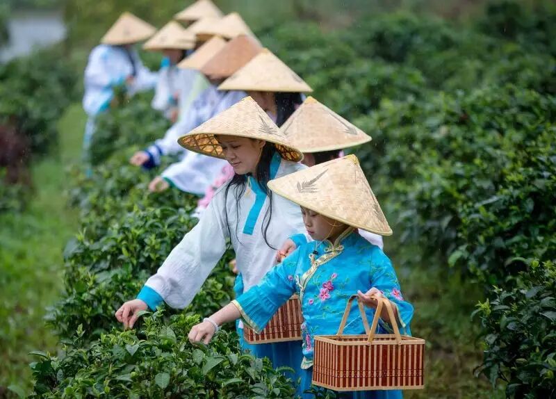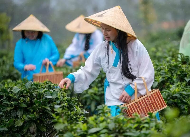 嘉賓們登上采摘臺準(zhǔn)備采摘茶王頭春