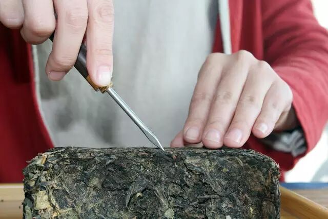 將茯茶平放在茶盤里,一手壓住茯茶,一手拿茶針,將茶針垂直于磚面扎入,稍微用力往外推,這樣一小塊茯茶就從茶磚上面輕松分離,按自己需要的量取來沖泡就可以了。