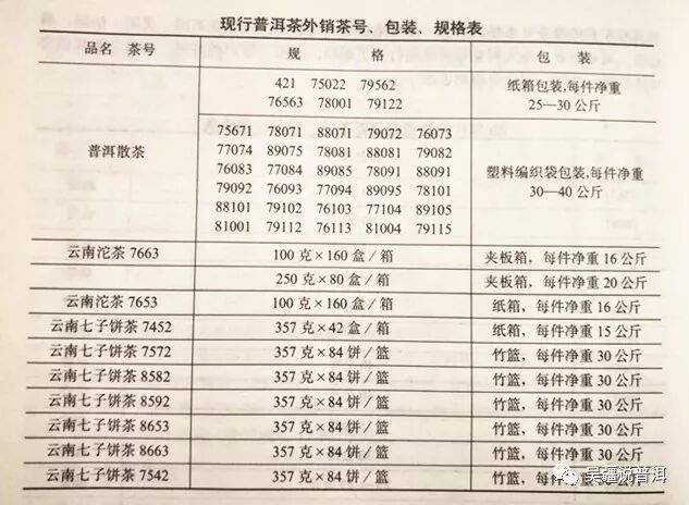 (以上圖片為1993年出版的《云南省茶葉進出口公司志》一書中“外銷普洱茶茶號、包裝、規(guī)格表”)