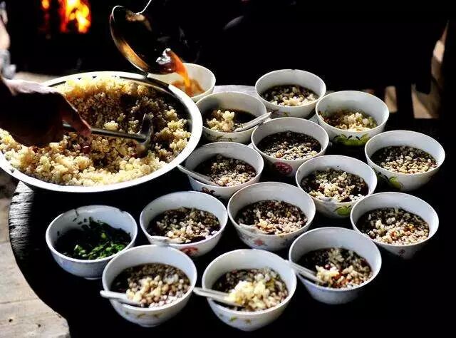 待客的油茶要把花生、玉米花、黃豆、芝麻、糯粑、筍干等佐料先炒好放入茶碗里,等到油茶出鍋后倒入茶碗,熱騰騰地遞到客人面前,配以主人熱情的笑容,暖意便從客人的五臟六腑蔓延開來。因?yàn)榕淞咸珜?shí)在,光靠喝是喝不盡的,必須用一雙筷子,才能把油茶吃個(gè)精光。