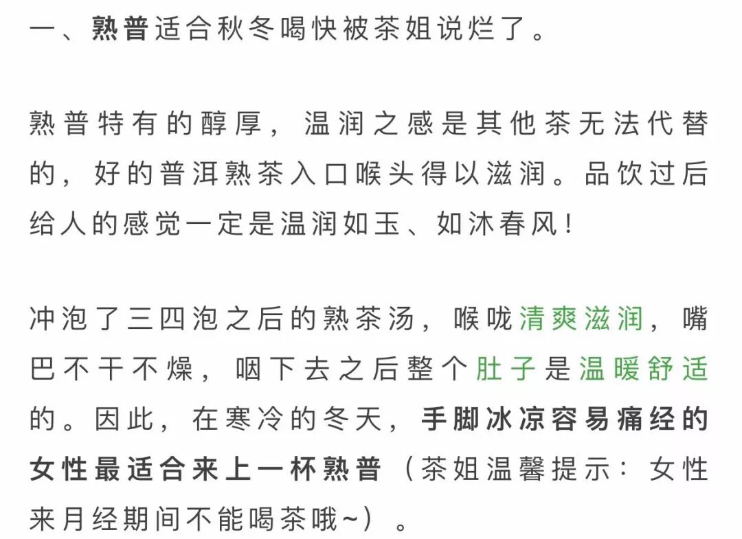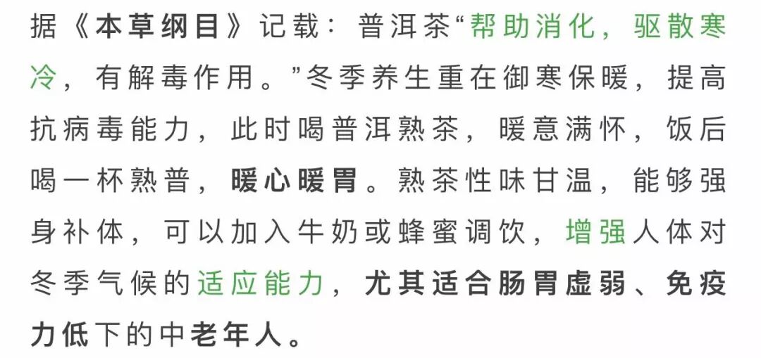 熟普和紅茶茶性比較溫和,對(duì)消化道尤其是胃部有問題的人群,有養(yǎng)胃、護(hù)胃的作用,且會(huì)影響正常睡眠。在寒冷的冬季,泡上一壺茶,茶香彌漫著整個(gè)房間,熱氣氤氳。沏上一杯,溫暖的紅色茶湯,熱熱的一小杯滑入喉嚨,醇厚,回味甘爽,杯底留香。在這寒意漸濃的立冬時(shí)節(jié),喝上這樣一杯熱茶,不但可以消除心中的寒意,嘴里芳香彌漫,暖心更暖胃!