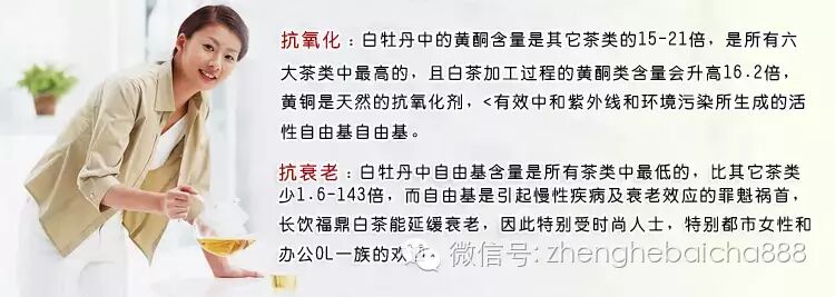 ? ? 白茶茶多酚含量高達157mg/g,具有很好的抗輻射功效,茶多酚被健康及醫(yī)學(xué)界譽為“輻射克星”和最好的清除自由基物質(zhì),據(jù)茶界泰斗陳椽教授研究表明六大茶類中白牡丹茶葉鮮葉的兒茶素多酚類總量最高,其抗輻射防衰老效應(yīng)達維生素E十倍,并由延緩心肌紫褐素生成之功,能大幅度降低太陽和電器等輻射的危害,因此福鼎白茶特別受現(xiàn)代時尚人士,都市女性和辦公OL一族的青睞。