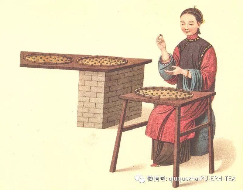 習慣飲用普洱(團)茶的麗江一帶民眾,后來除了改喝沱茶以外,下關還生產一種重約50克的“餅茶” (又稱“小餅茶”“七子筒”)應市。生產這種重量的餅茶,可能是受到普洱貢(團)茶中“蕊珠茶”(重一兩五錢約54克)的啟發(fā)。1800年,英國皇家軍團少校喬治·亨利梅森曾經(jīng)創(chuàng)作了一張疑似“制作蕊珠茶”時的版畫(如下圖):