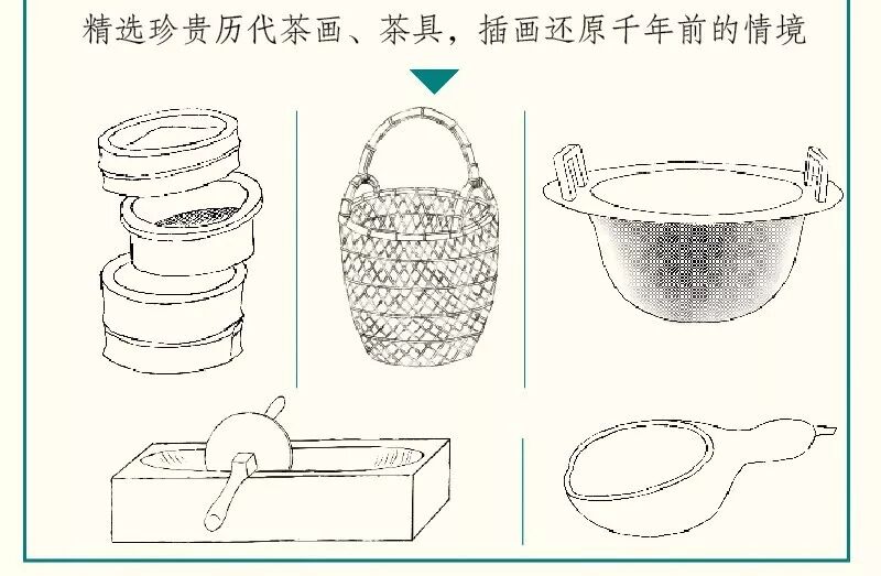 2.給茶經(jīng)中的器和具配上了線描圖,以繪畫的方式再現(xiàn)飲茶場景;