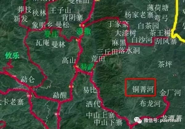 嚴(yán)格說銅箐河不屬于易武鎮(zhèn),但離易武很近,屬于古曼撒茶區(qū)范圍,所以現(xiàn)在茶友們都把它貴為易武茶了。銅箐河是路程十分艱難的茶區(qū),銅箐河的茶樹依山崖而生,頗有陽崖陰林之感,銅箐河有許多茶樹年齡不遜于落水洞、茶王樹的大茶樹,只是比較分散。