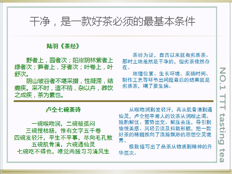 在陸羽認為的禁忌環(huán)境中生長的茶不適合飲用,即使生長在好源頭的茶,制茶過程中任一環(huán)節(jié)出問題都會成為損害健康的劣茶,人喝了就要得病。