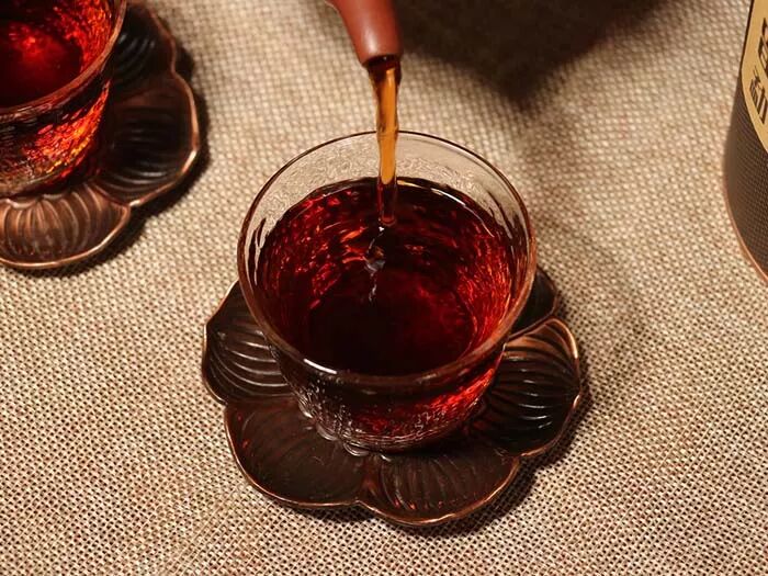 的深淺、明亮。優(yōu)質(zhì)的云南普洱茶散茶,泡出的茶湯紅濃明亮,具“金圈”,湯上面看起來有油珠形的膜。質(zhì)次的,茶湯紅而不濃,欠明亮,往往還會(huì)有塵埃狀物質(zhì)懸浮其中,有的甚至發(fā)黑,發(fā)烏,俗稱“醬油湯”。