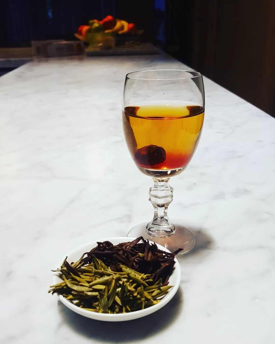Award Winning Golden Sunset:取一粒希臘酸櫻桃(Glyko Vyssino),放在一個120ml 的小雪利酒杯中,分別沖泡中國黃芽黃茶和臺灣地區(qū)的 Hon Yun 21烏龍茶,將茶湯(1/3烏龍茶和2/3黃茶)倒入酒杯混合即可。